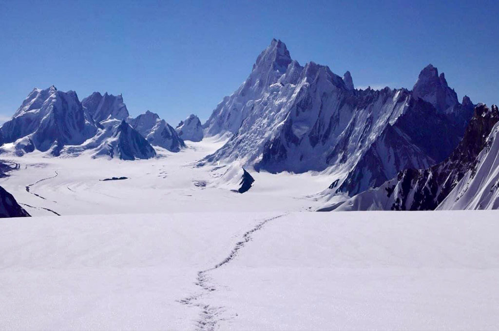 The early morning light finds us beginning our Snow Lake and Biafo Hisper trek as the Loads are distributed among the porters. Walks through Askoli 3000 m and past the confluence of the Biafo and Biafo rivers, following the true right bank of the Biafo River to Kisar Shaguran, beyond which the trails to the Biafo Glacier divide, the Biafo turn to the northeast and the Baltoro continues east. Move onto the moraine-covered Biafo glacier. Have a nice view of Pyramidal Baakhor Das Peak.